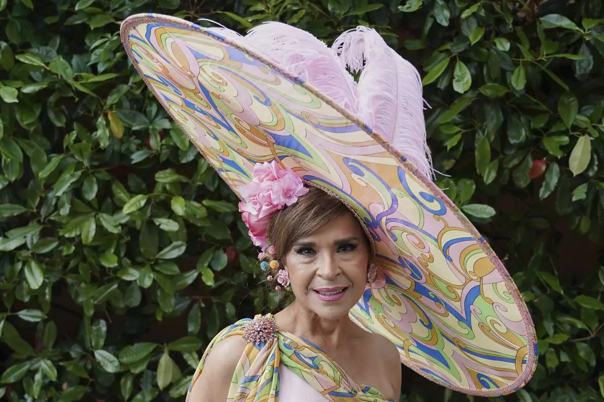 Ines Hernandez Tallaj wearing a large Muti coloured hat poses for photographs on the first day of the Royal Ascot horse race meeting at Ascot, England, Tuesday, June 17, 2025. (AP Photo/Alberto Pezzali)