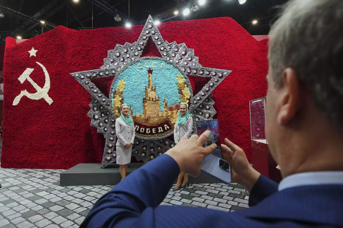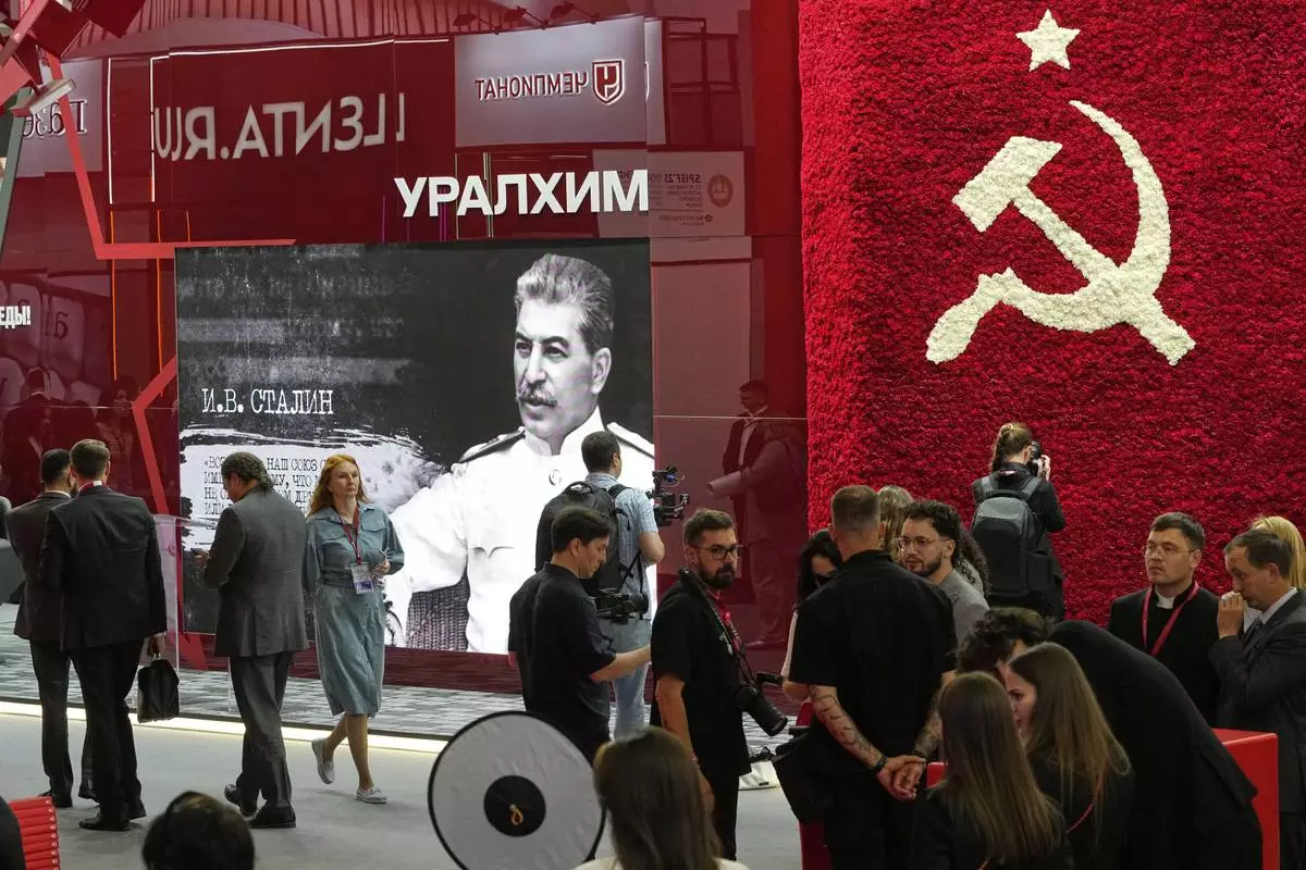Guests and participants walk in front of an image of Soviet Leader Josef Stalin and a Soviet symbol on the sidelines of the St. Petersburg International Economic Forum in St. Petersburg, Russia, Wednesday, June 18, 2025. (AP Photo/Dmitri Lovetsky)