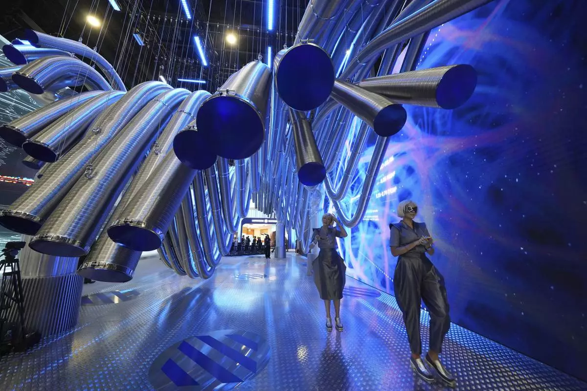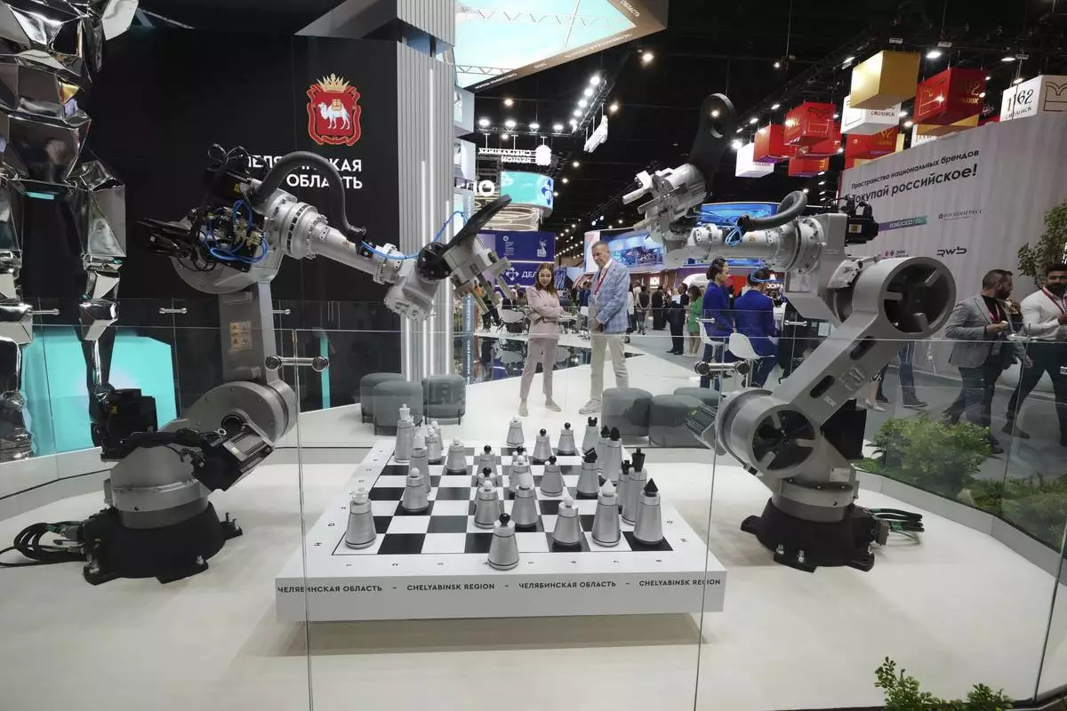 Visitors look at an exhibition on the sidelines of the St. Petersburg International Economic Forum in St. Petersburg, Russia, Wednesday, June 18, 2025. (AP Photo/Dmitri Lovetsky)