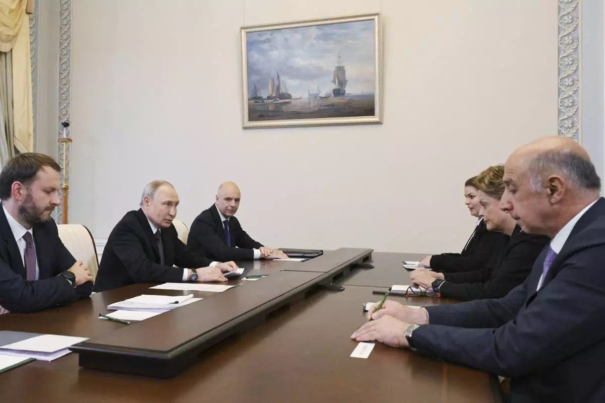 Russian President Vladimir Putin, second left, speaks with the President of the New Development Bank Dilma Rousseff, second right, on the sidelines of the St. Petersburg International Economic Forum in St. Petersburg, Russia, Wednesday, June 18, 2025. (Alexei Danichev, Sputnik, Kremlin Pool Photo via AP)