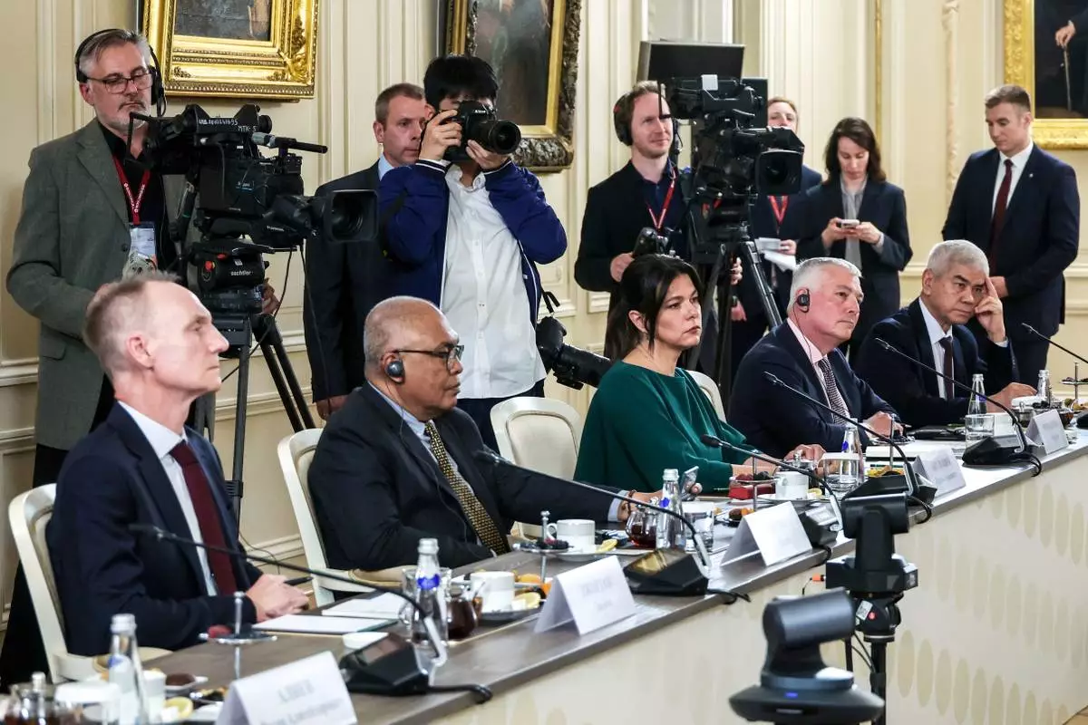 From left, The Associated Press News Director of Europe/Africa James Jordan, ANTARA News Director Akhmad Munir, BELTA Director General Iryna Akulovich, DPA Head of News Service Martin Romanczyk and Uzbekistan National News Agency Director General Abdusaid Kuchimov attend a meeting of Russian President Vladimir Putin with the heads of international news agencies at the newly renovated St. Petersburg Rimsky-Korsakov State Conservatory on the sidelines of the St. Petersburg International Economic Forum in St. Petersburg, Russia, Thursday, June 19, 2025. (Alexander Demyanchuk, Sputnik, Kremlin Pool Photo via AP)