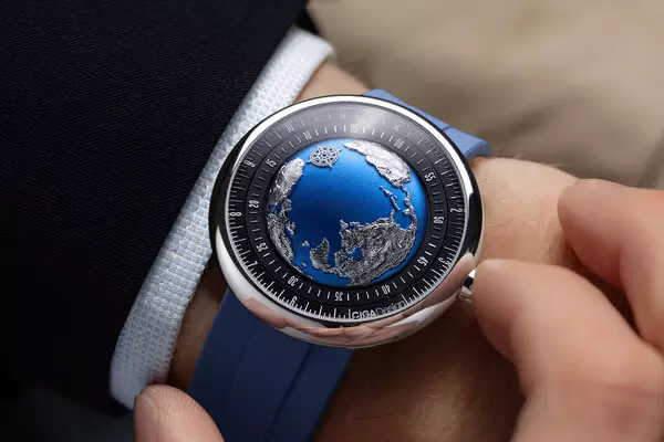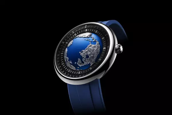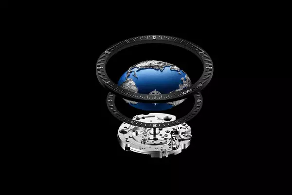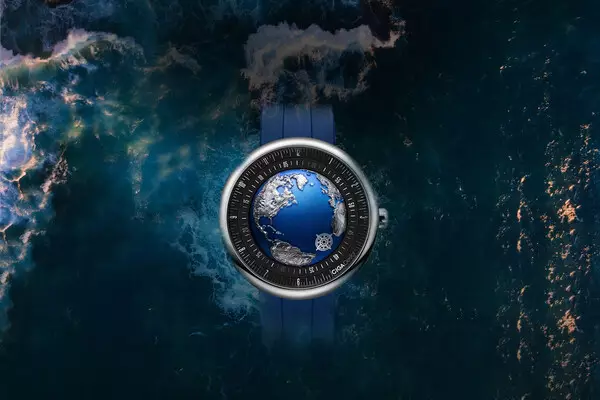 The Blue Planet II • Atlantic features CIGA design's award-winning Asynchronous-Follow Movement Technology, inspired by ancient sundials and honored by the GPHG. A single compass hand indicates both hours and minutes, gliding across a dynamic minute dial and a stationary hour ring. With every 30° movement of the hour gear, the minute dial rotates 390°, creating a unique and intuitive expression of time in harmony with the globe's rhythm and ocean currents.