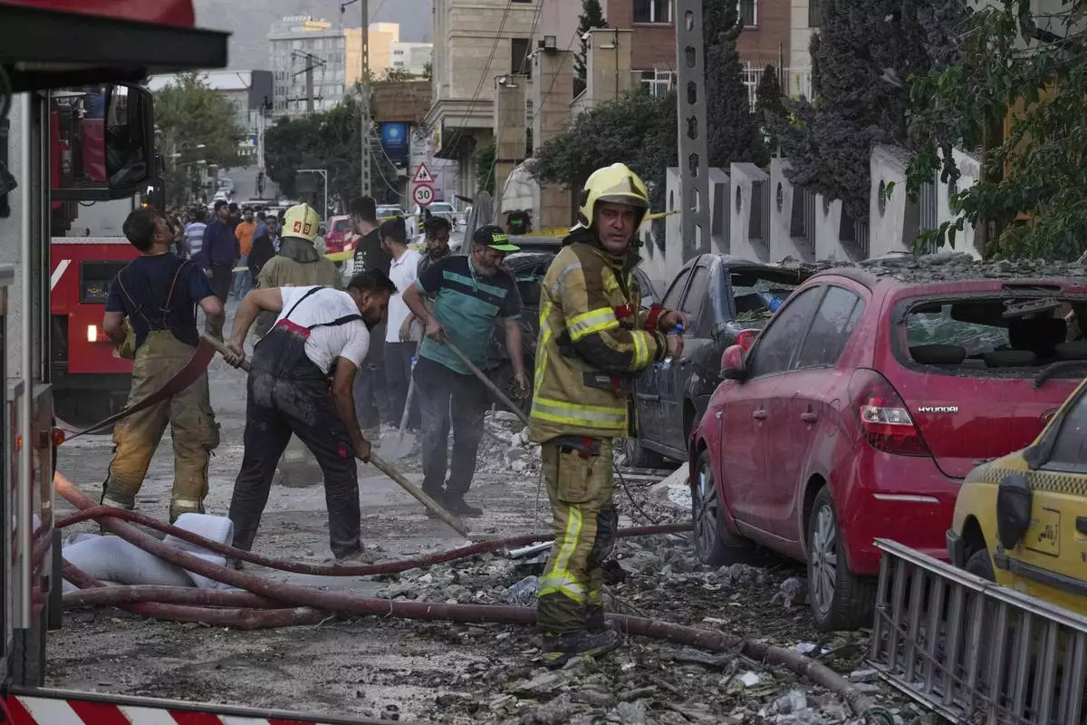 Firefighters and people clean up the scene of an explosion at a residence compound after Israeli attacks in Tehran, Friday, June 13, 2025. (AP Photo/Vahid Salemi)