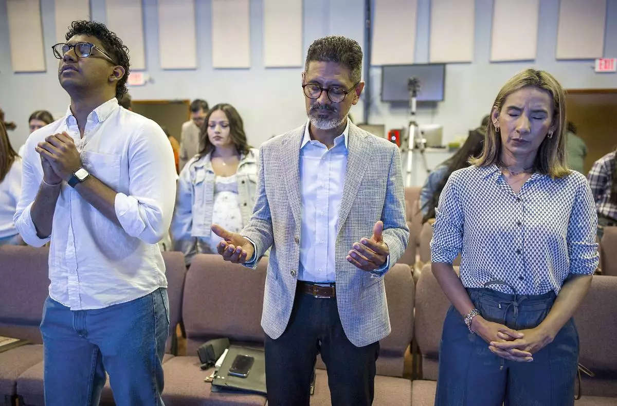 José Luis Orozco, a pastor from Nicaragua, prays with his son, Josias, 17, left, and wife, Ruth, before speaking to members of the Oasis Church, in Taylor, Texas, June 15, 2025. (AP Photo/Rodolfo Gonzalez)