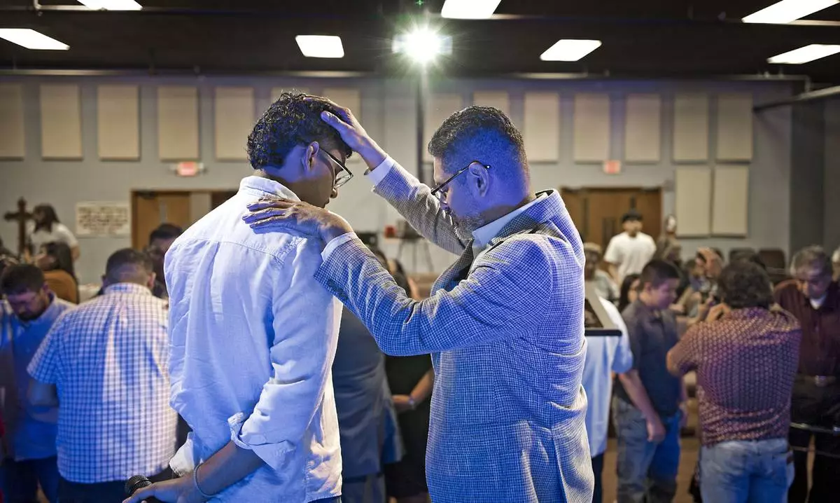 José Luis Orozco, a pastor from Nicaragua, ministers to members of the Oasis Church, in Taylor, Texas, on June 15, 2025. (AP Photo/Rodolfo Gonzalez)