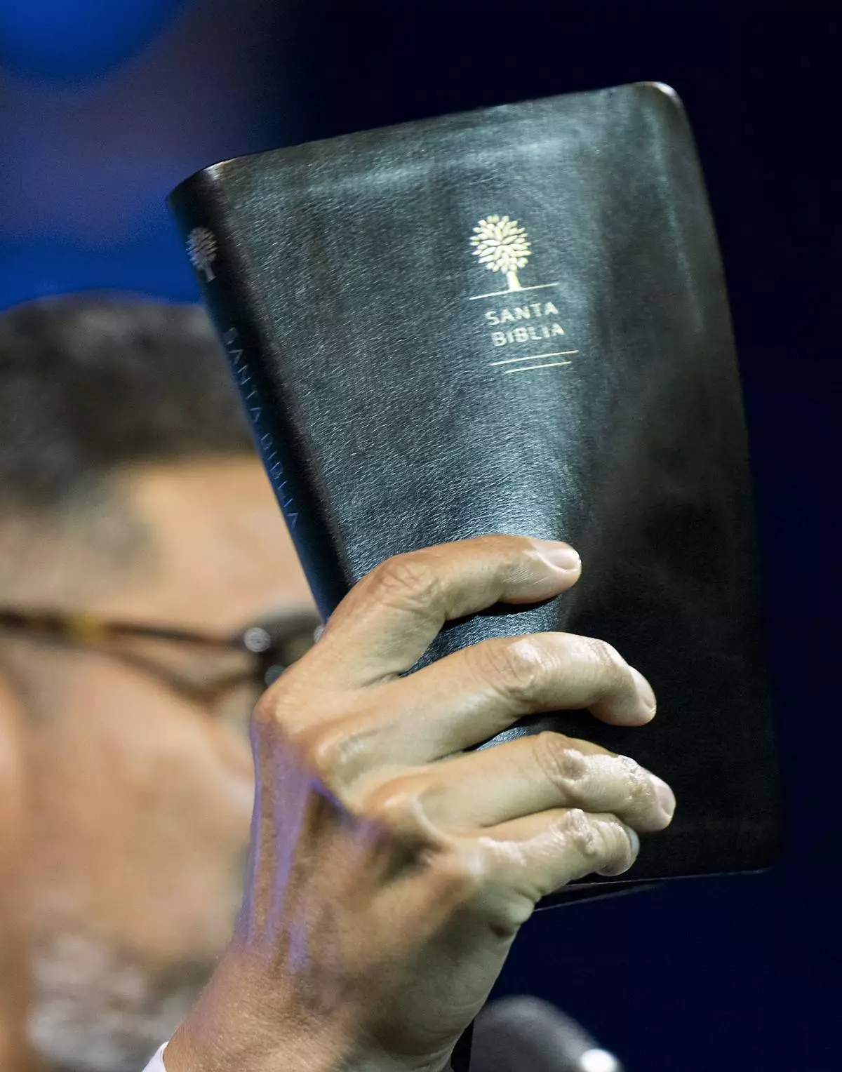 José Luis Orozco, a pastor from Nicaragua, holds up his bible as he ministers to members of the Oasis Church, in Taylor, Texas, June 15, 2025. (AP Photo/Rodolfo Gonzalez)