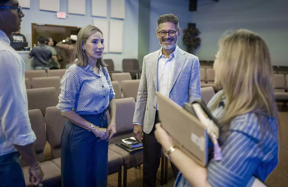 José Luis Orozco, a pastor from Nicaragua, speaks to Oasis Church, senior pastor, Maria Flores, right, following a sermon by Orozco, as son, Josias, and wife, Ruth, look on, in Taylor, Texas, June 15, 2025. (AP Photo/Rodolfo Gonzalez)