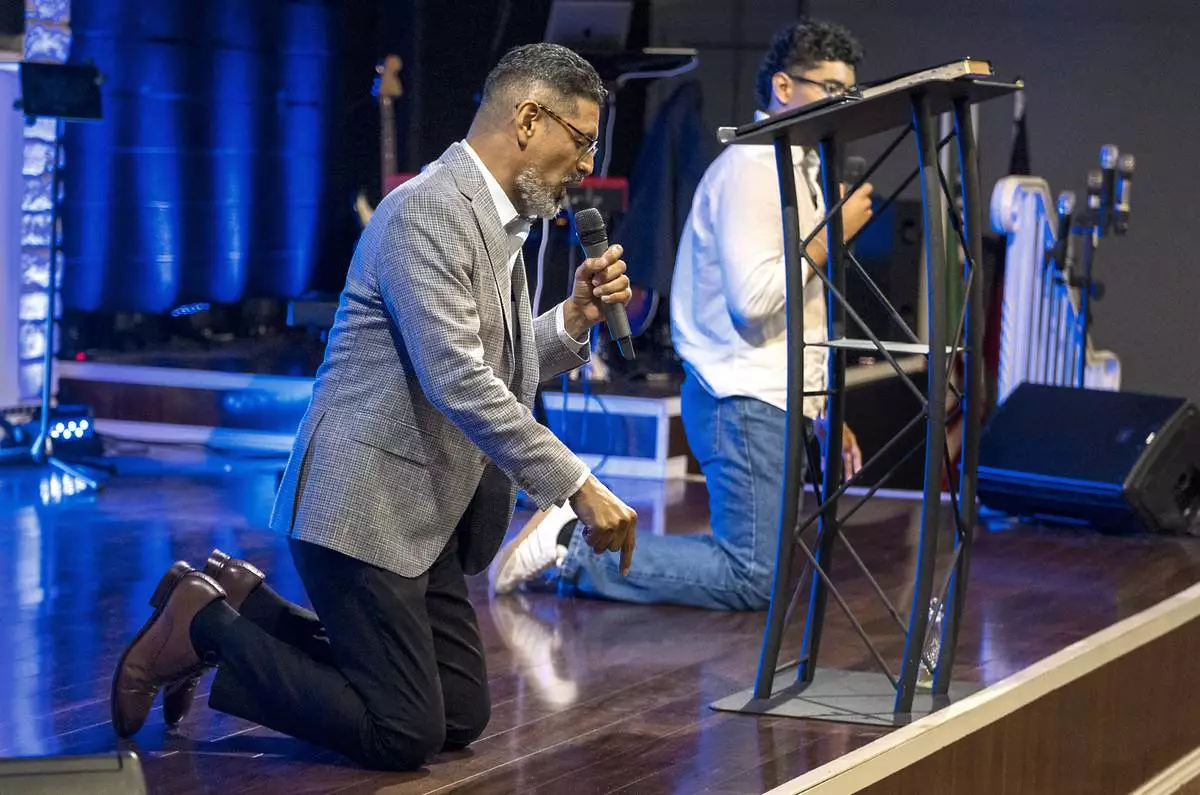 José Luis Orozco, a pastor from Nicaragua, kneels on stage as he ministers to members of the Oasis Church, in Taylor, Texas, June 15, 2025. (AP Photo/Rodolfo Gonzalez)