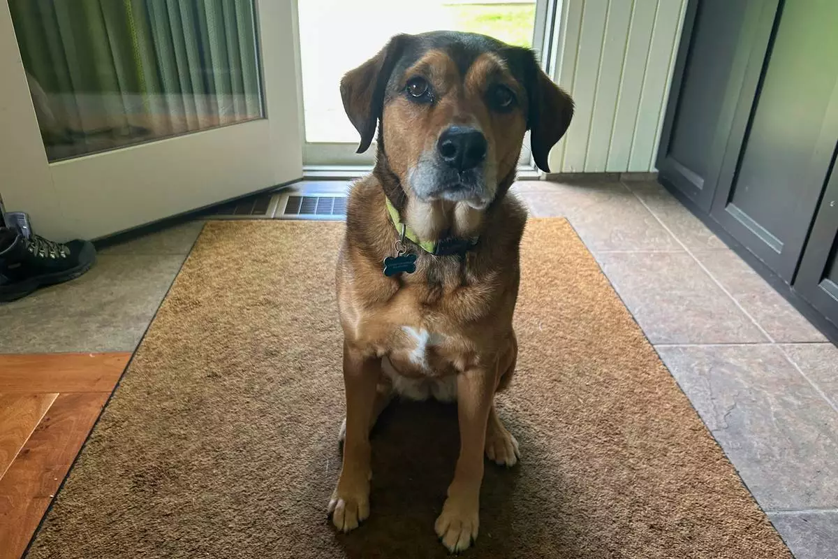 Cookie, an eight-year-old German shepherd mix with anxiety, appears at a home in Waitsfield, Vt., on Saturday, June 14, 2025. (AP Photo/Carolyn Lessard)