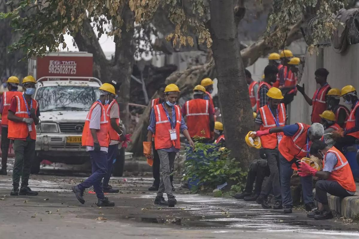 Local workers take a break near the site of the deadly Air India plane crash in Ahmedabad, India, Monday, June 16, 2025. (AP Photo/Rafiq Maqbool)