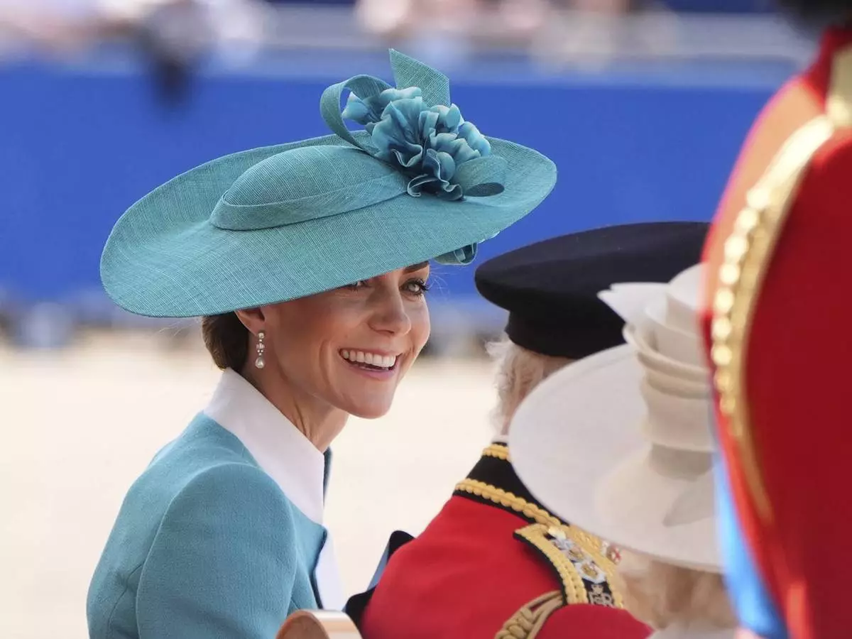 Britain's Kate, The Princess of Wales smiles during the Trooping the Colour, the king's annual birthday parade, at Horse Guards Parade, in London, Saturday, June 14, 2025. (Jonathan Brady/PA via AP)