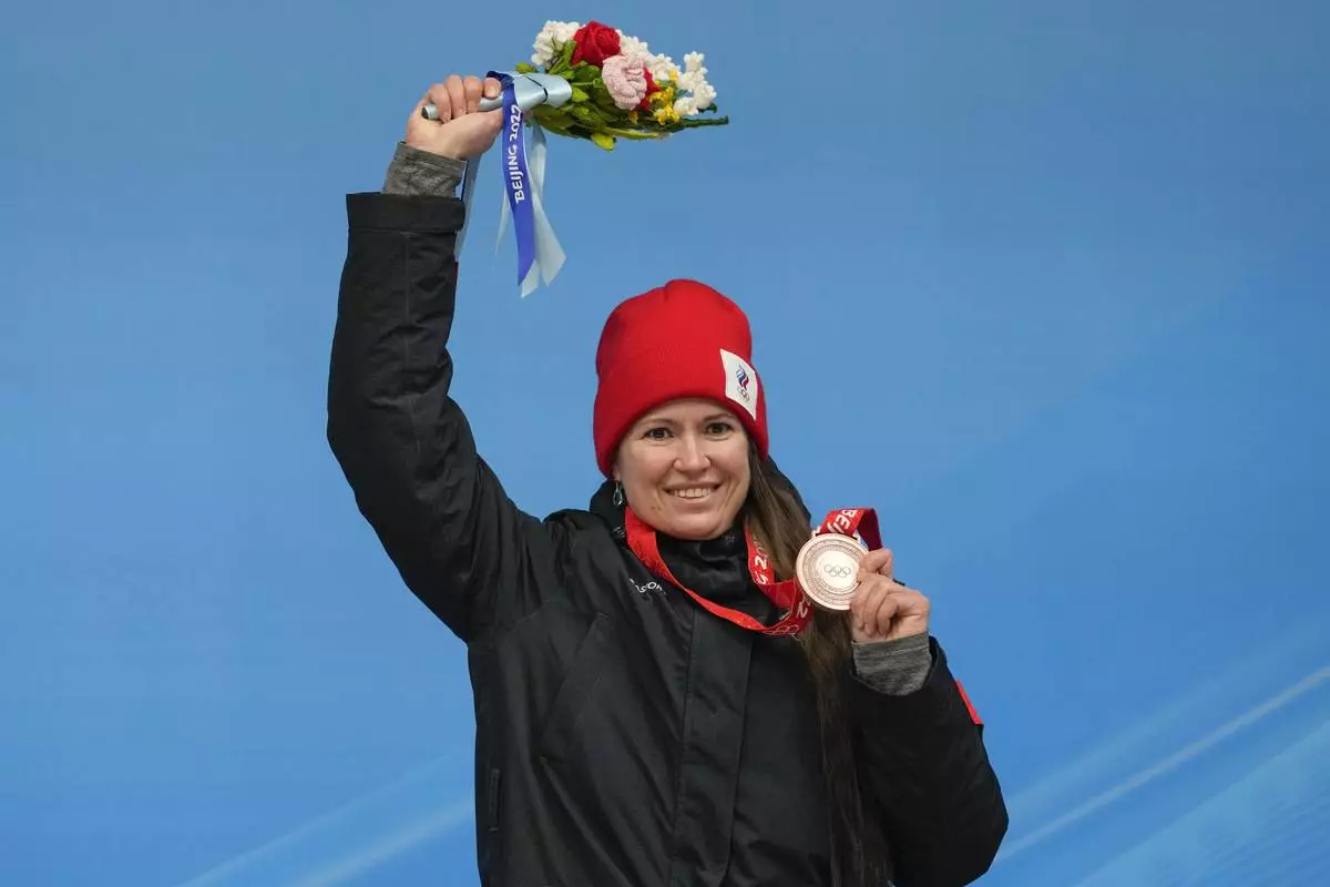 FILE - Tatyana Ivanova, of Russian Olympic Committee, celebrates winning the bronze medal in the luge women's singles at the 2022 Winter Olympics, Tuesday, Feb. 8, 2022, in the Yanqing district of Beijing. (AP Photo/Mark Schiefelbein, File)