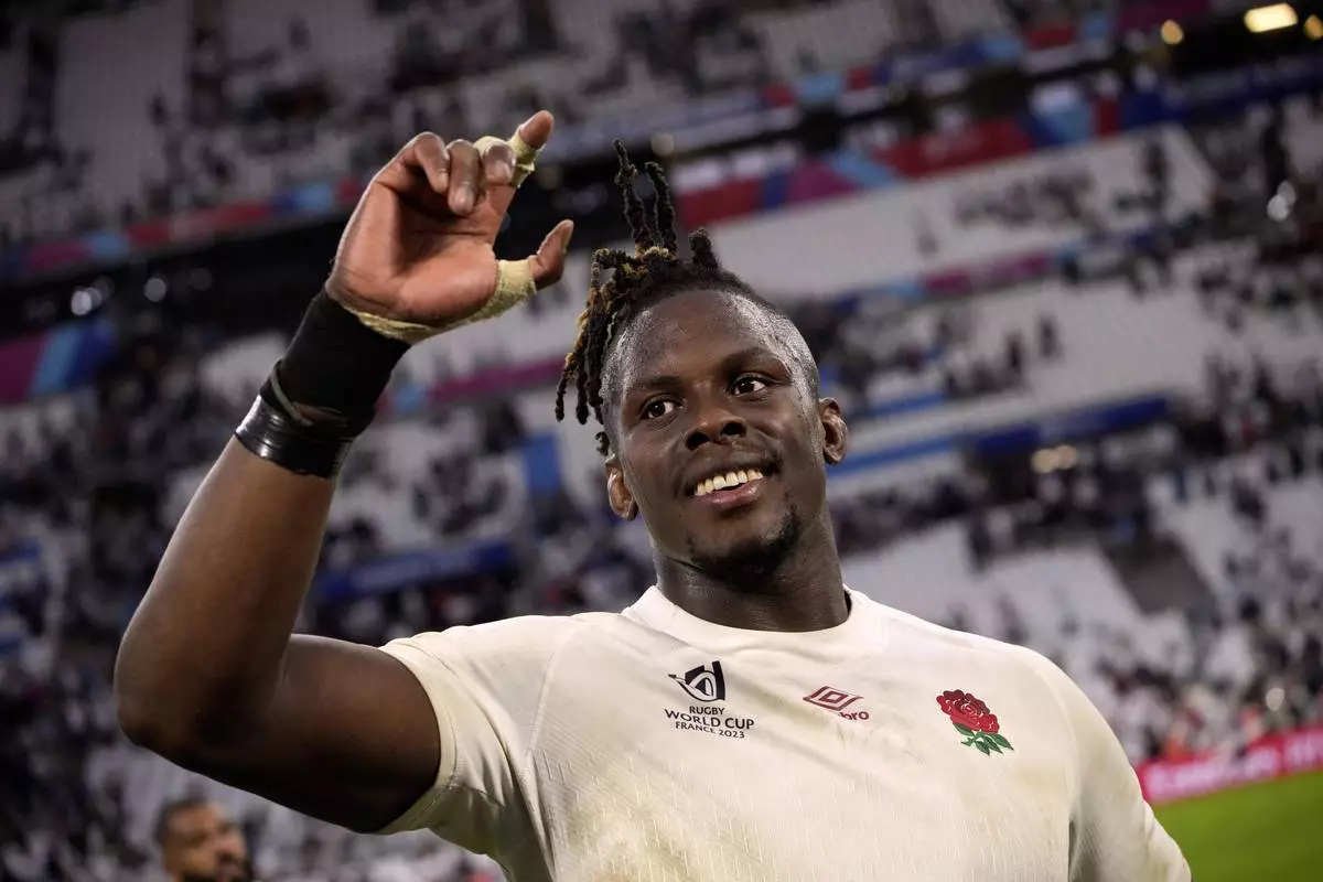 FILE - England's Maro Itoje celebrates after his team won the Rugby World Cup quarterfinal match between England and Fiji at the Stade de Marseille in Marseille, France, Sunday, Oct. 15, 2023. (AP Photo/Laurent Cipriani, File)