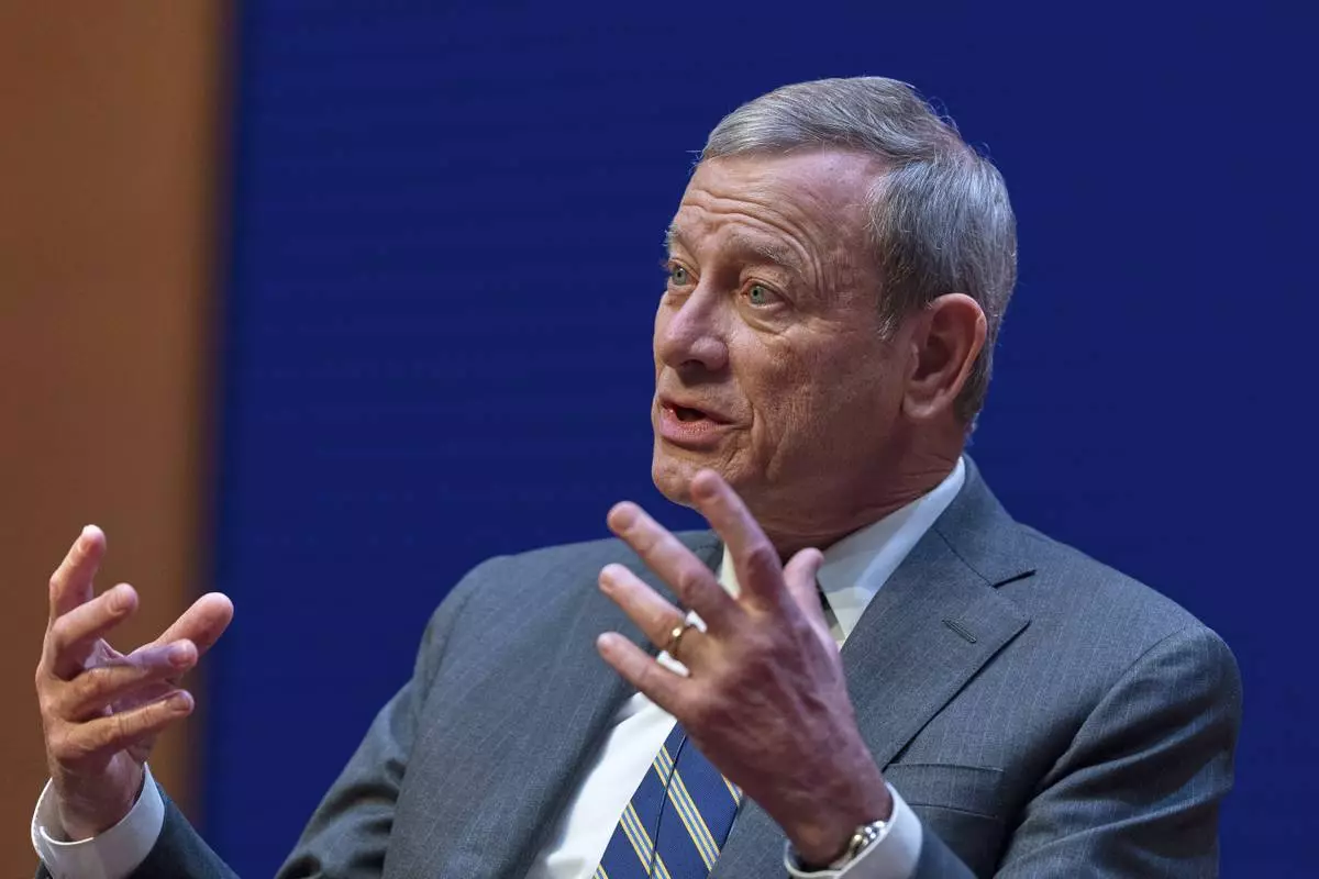 FILE - Chief Justice of the U.S. Supreme Court John Roberts speaks during a lecture to the Georgetown Law School graduating class of 2025, in Washington, May 12, 2025. (AP Photo/Manuel Balce Ceneta, File)