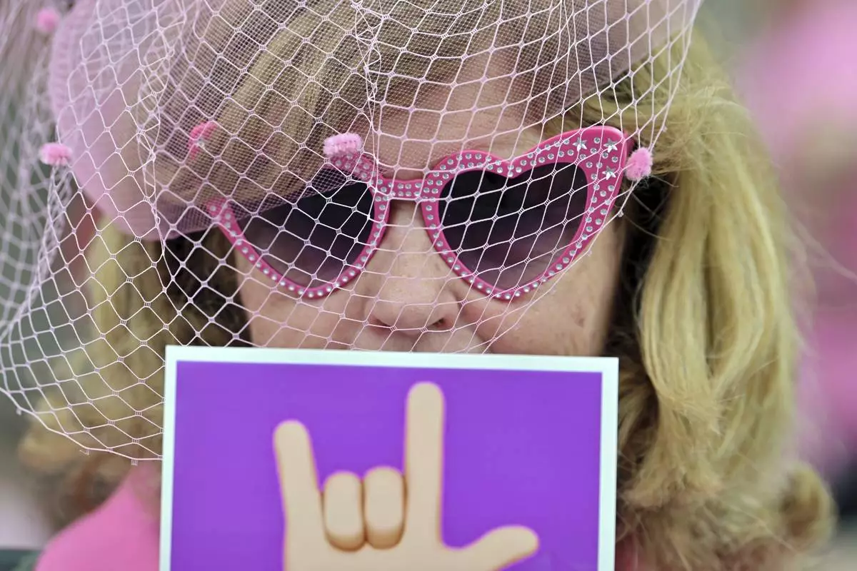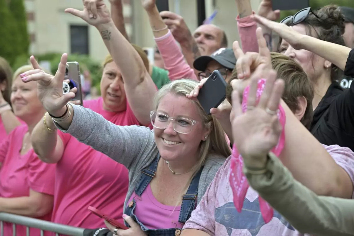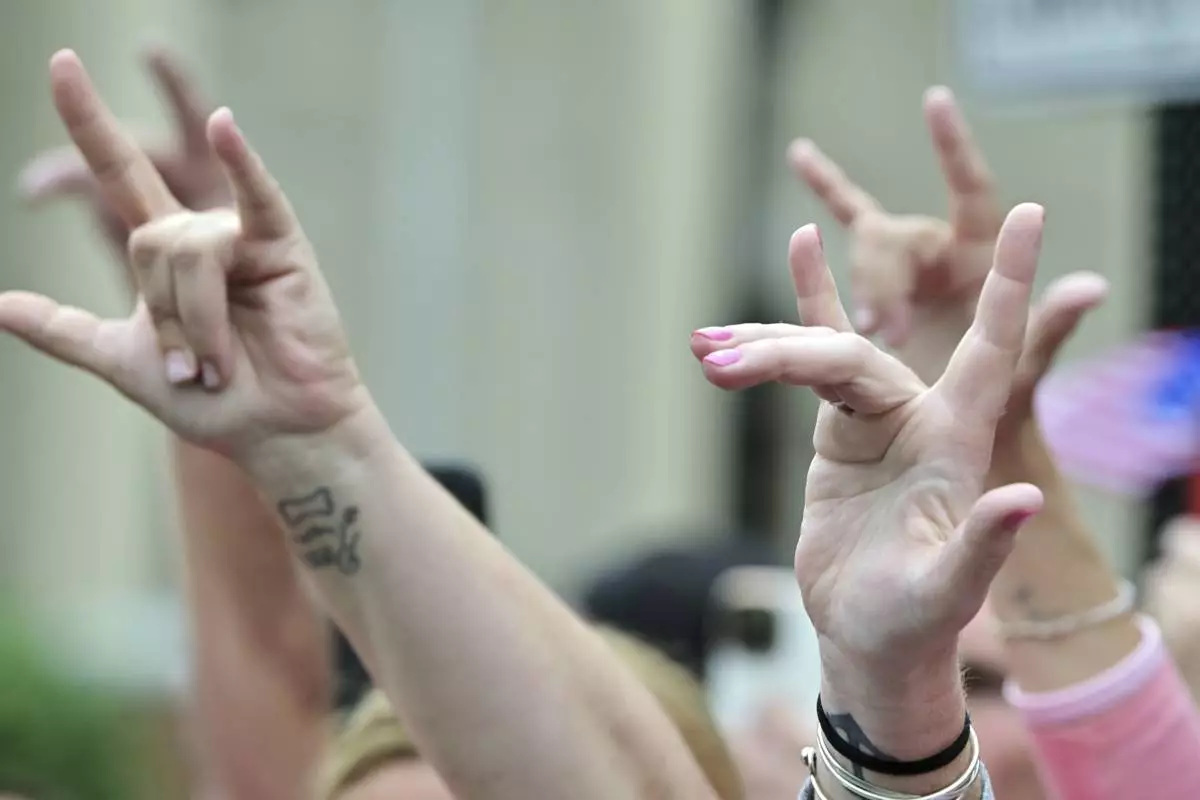Supporters of Karen Read make the American Sign Language sign for "I Love You" as she leaves the courthouse at the start of the third day of jury deliberations in Read's trial at Norfolk Superior Court, Wednesday, June 18, 2025, in Dedham, Mass. (AP Photo/Josh Reynolds)