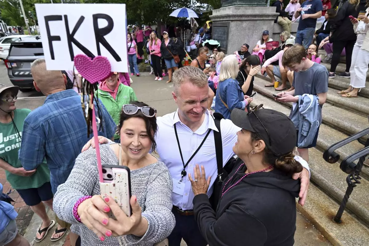 Blogger Aidan Kearney, center, meets with fans and Karen Read supporters, from left, Linda Allen of Rockland, MA, and Shannon LoPorto of Weymouth, MA, outside the Dedham, Mass. courthouse on the third day of jury deliberations in Read's trial at Norfolk Superior Court, Wednesday, June 18, 2025, in Dedham, Mass. (AP Photo/Josh Reynolds)