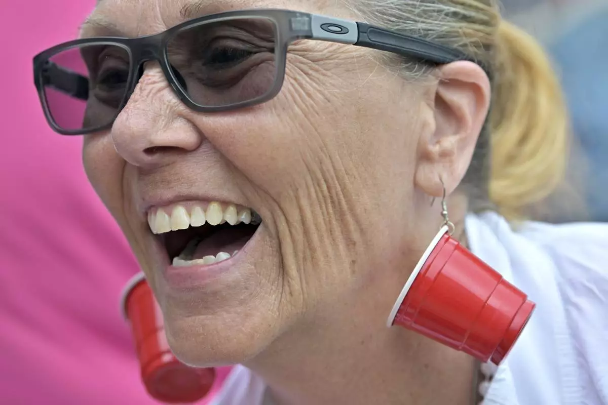 Karen Read supporter Bonnie Fitzgibbon of Chelmsford, MA, wears earrings mocking the investigation into the death of John O'Keefe outside the courthouse on the third day of jury deliberations in Read's trial at Norfolk Superior Court, Wednesday, June 18, 2025, in Dedham, Mass. (AP Photo/Josh Reynolds)