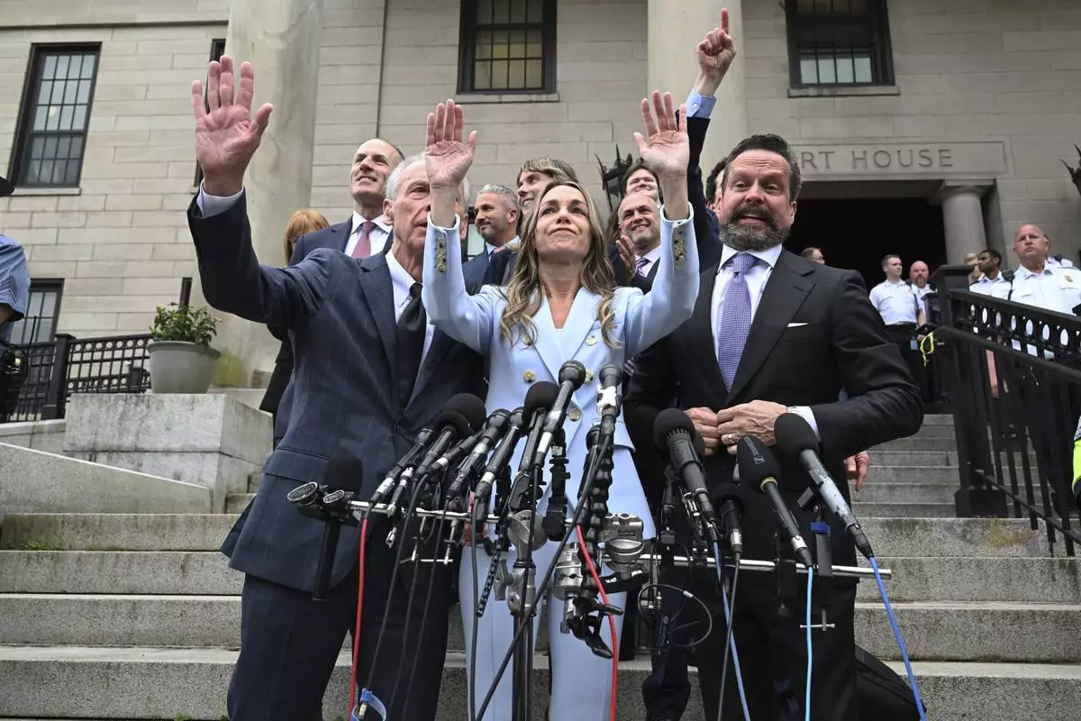 Karen Read, center, waves to supporters after she was found not guilty of second-degree murder on Wednesday, June 18, 2025, in Dedham, Mass. (AP Photo/Josh Reynolds)