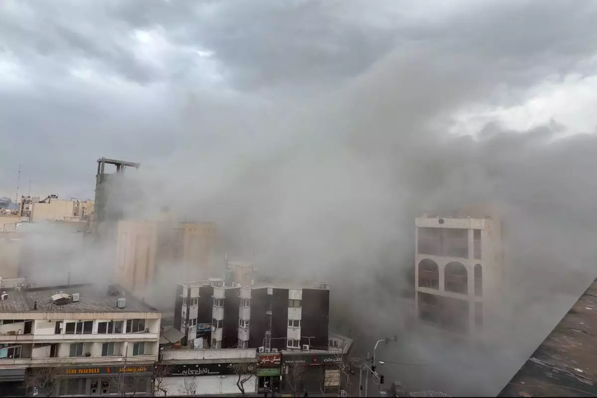 Smoke engulfs a street after a strike in Tehran, Iran, Monday, March 2, 2026. (AP Photo/Mohsen Ganji)