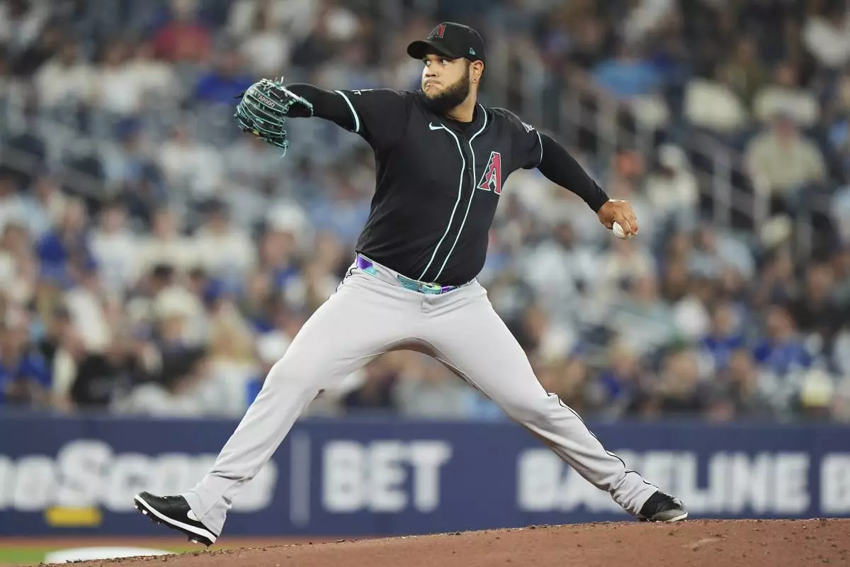 Arizona Diamondbacks pitcher Eduardo Rodriguez (57) works against the Toronto Blue Jays during the first inning of a baseball game in Toronto, Wednesday, June 18, 2025. (Frank Gunn/The Canadian Press via AP)
