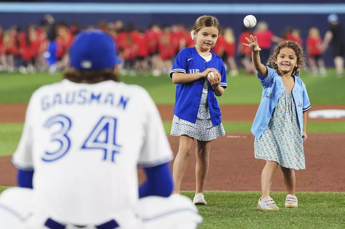 Toronto Blue Jays pitcher Kevin Gausman (34) catches the ceremonial first pitch from his daughters Sutton, right, and Sadie prior to the first inning of a baseball game against the Arizona Diamondbacks in Toronto, Wednesday, June 18, 2025. (Frank Gunn/The Canadian Press via AP)