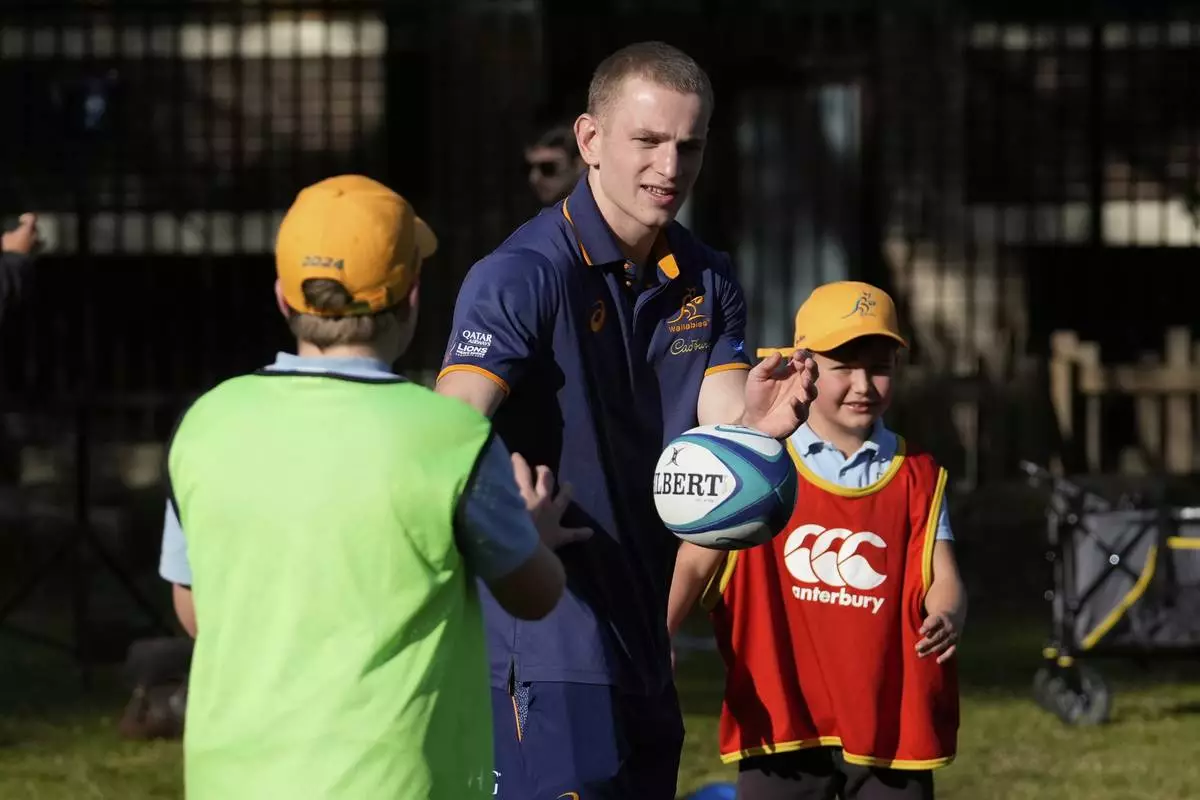 Australian rugby union player Max Jorgensen, center, goes through a skills drill with students at Stanmore Public School in Sydney, Australia, Thursday, June 19, 2025, after the announcement of the squad that will that will be considered for a position in the three-test series against the British and Irish Lions. (AP Photo/Rick Rycroft)