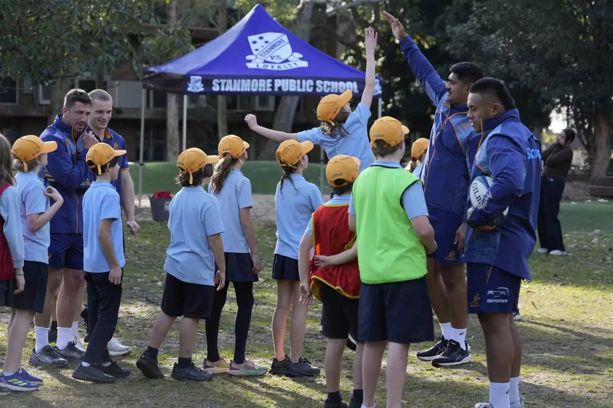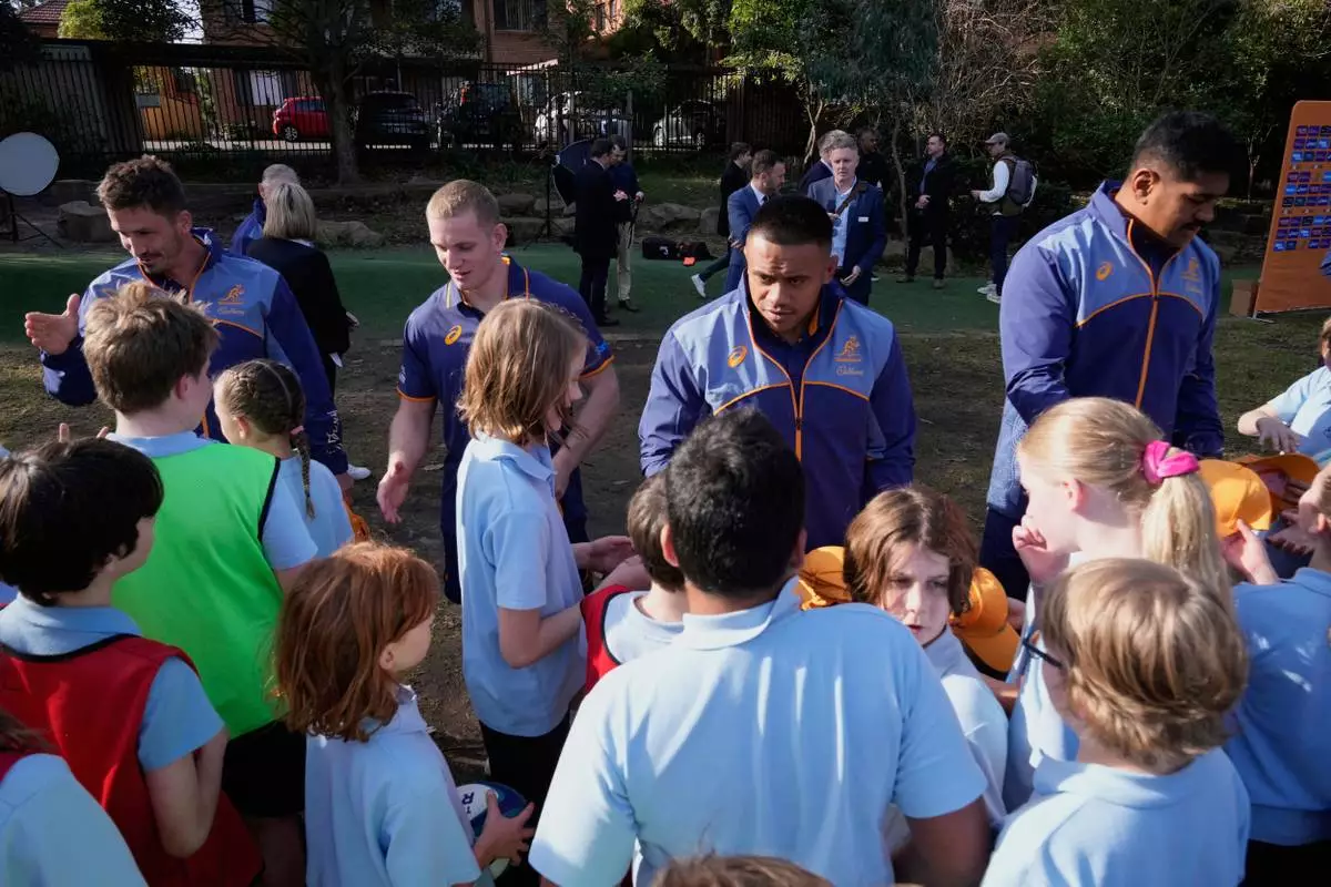 Australian rugby union players Allan Alaalatoa, right, Jake Gordon, left, Max Jorgensen, second left, and Will Skelton interact with students at Stanmore Public School in Sydney, Australia, Thursday, June 19, 2025, after the announcement of the squad that will that will be considered for a position in the three-test series against the British and Irish Lions. (AP Photo/Rick Rycroft)