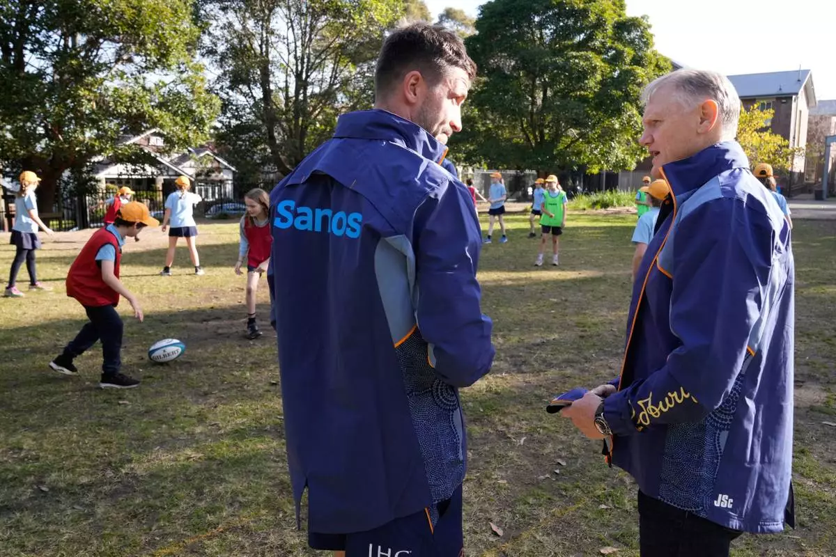 Australia Rugby head coach Joe Schmidt, right, talks with player Jake Gordon as students go through skill drills at Stanmore Public School in Sydney, Australia, Thursday, June 19, 2025, after the announcement of the squad that will that will be considered for a position in the three-test series against the British and Irish Lions. (AP Photo/Rick Rycroft)