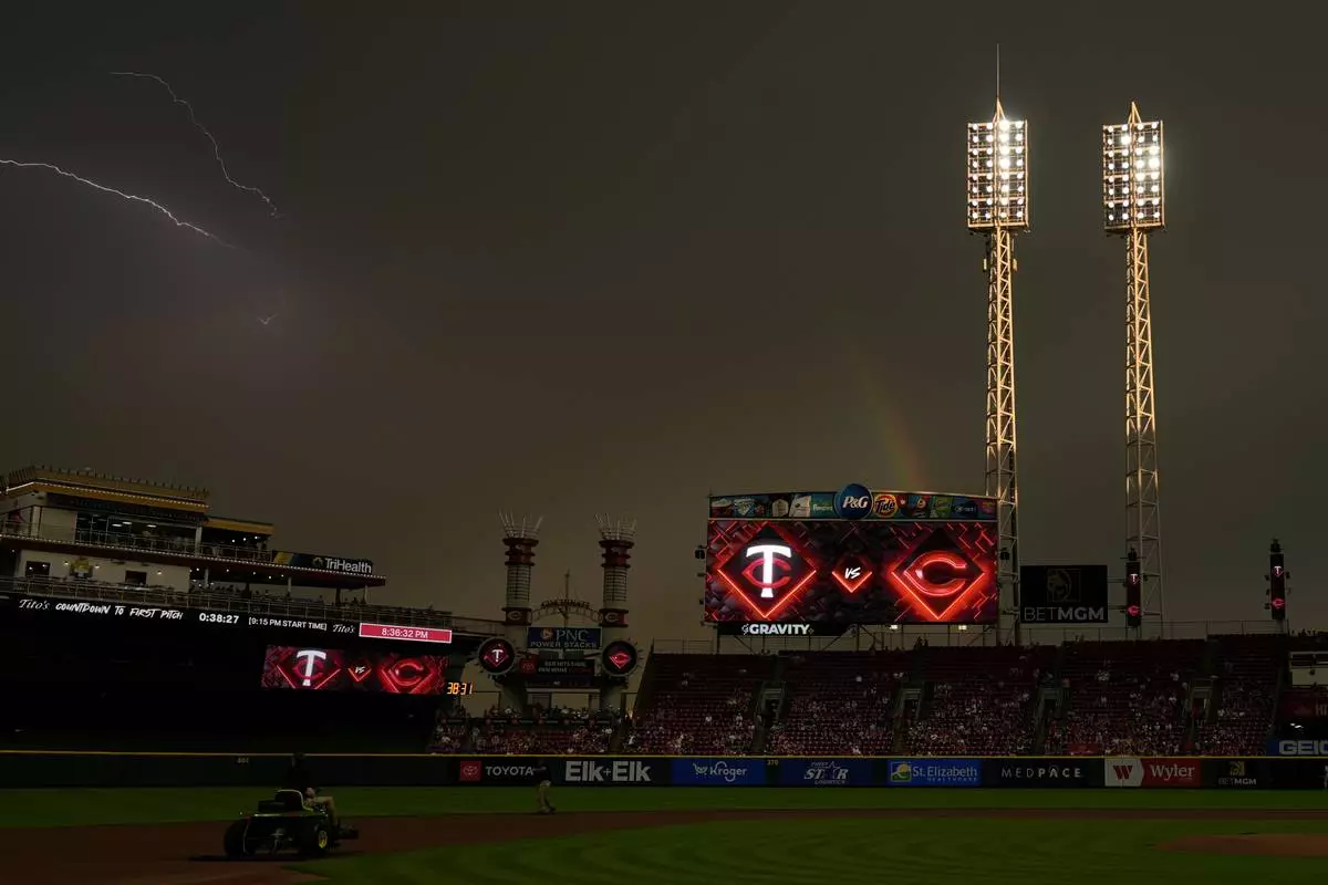 As the sun breaks through, a rainbow and lighting are seen over Great American Ball Park at the end of a weather delay before a baseball game between the Cincinnati Reds and the Minnesota Twins, Wednesday, June 18, 2025, in Cincinnati. (AP Photo/Carolyn Kaster)