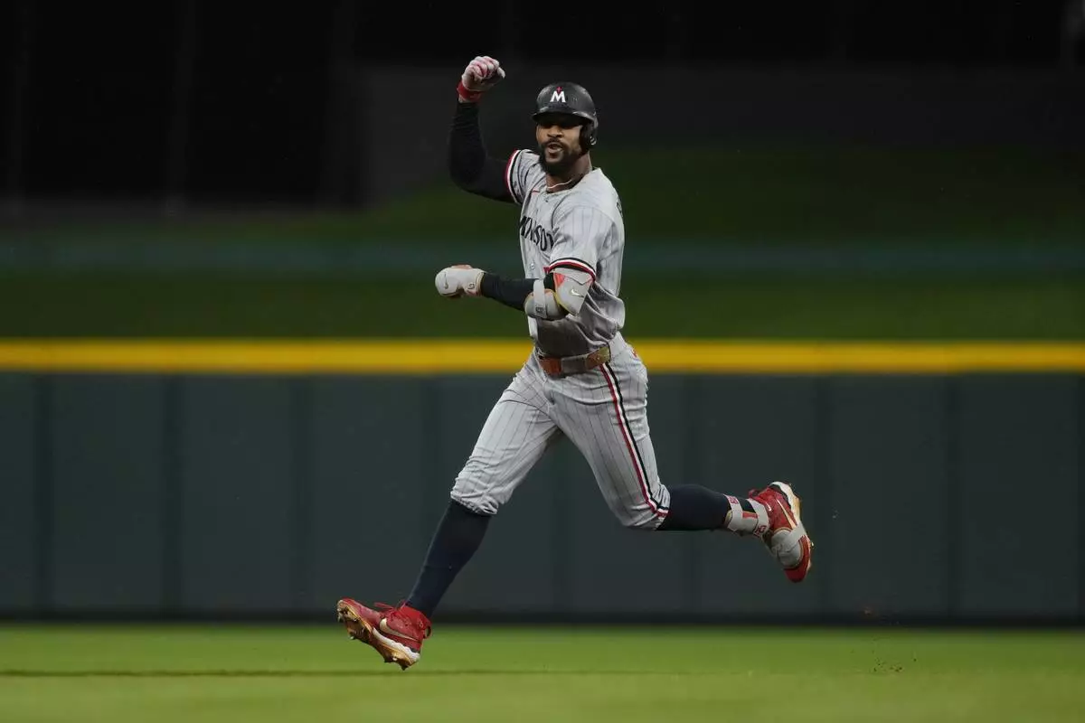 Minnesota Twins' Byron Buxton celebrates hitting a solo home run as he rounds the bases in the first inning of a baseball game against the Cincinnati Reds, Wednesday, June 18, 2025, in Cincinnati. (AP Photo/Carolyn Kaster)