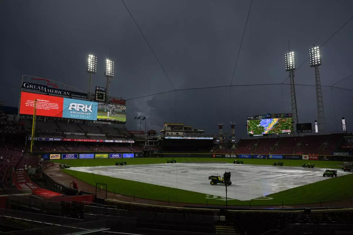 Dark storm clouds over Great American Ball Park during a weather delay before a baseball game between the Cincinnati Reds and the Minnesota Twins, Wednesday, June 18, 2025, in Cincinnati. (AP Photo/Carolyn Kaster)