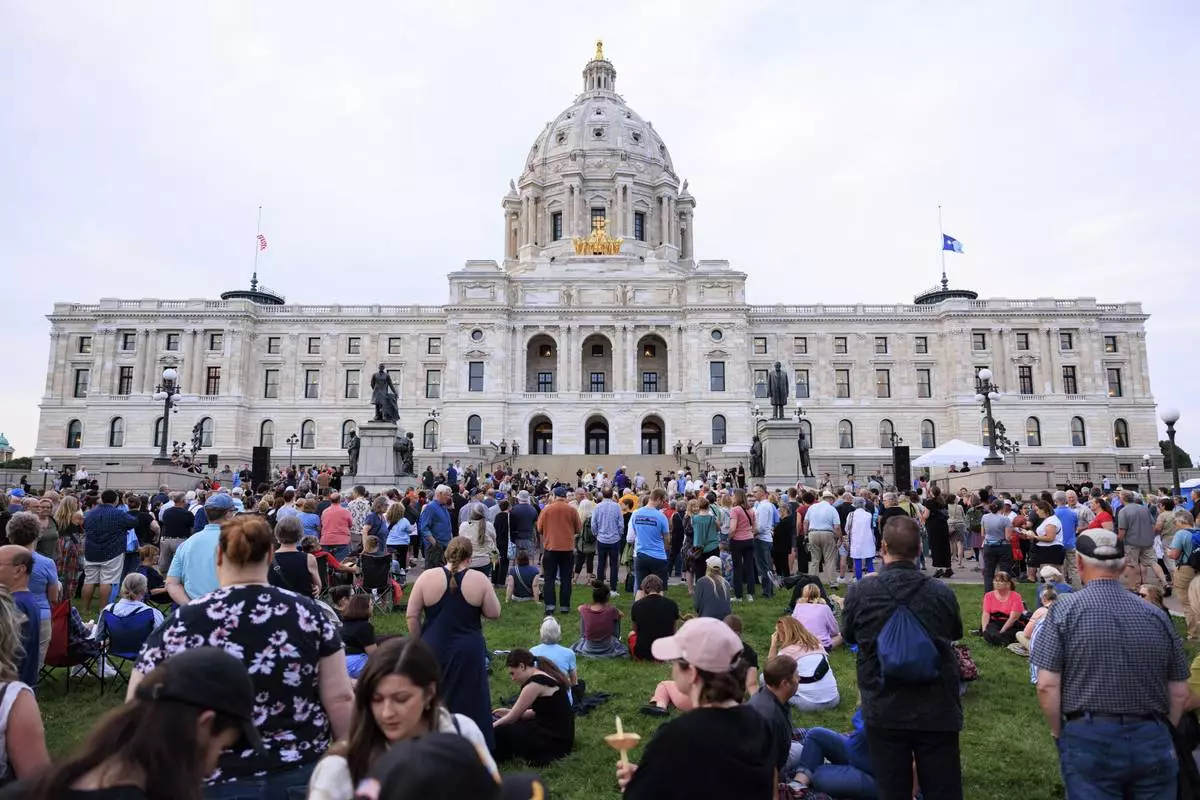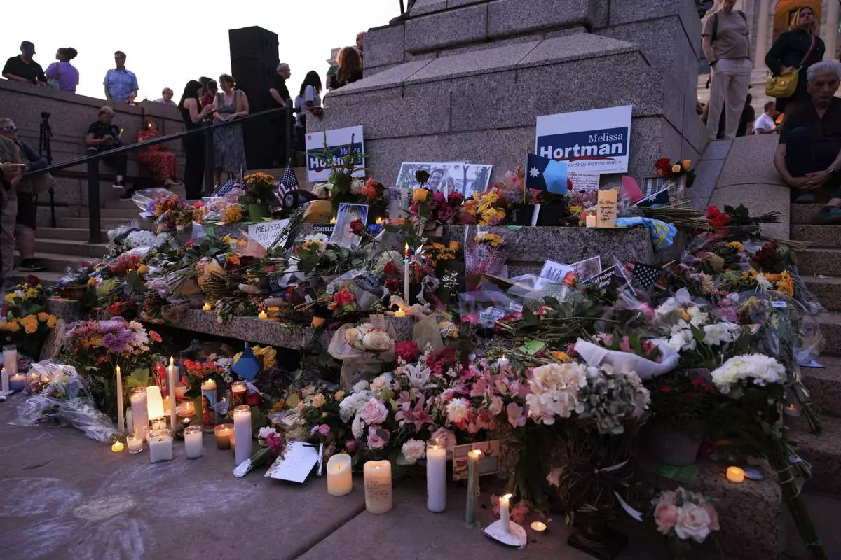 ST. PAUL, Minn. (AP) — Hundreds gathered outside Minnesota’s Capitol for a candlelight vigil honoring former House Speaker Melissa Hortman and her husband, Mark, who were fatally shot at their home. Governor Tim Walz, visibly moved, comforted mourners as the couple’s son, Colin, placed a photo of his parents at a growing memorial filled with flowers, flags and heartfelt messages.