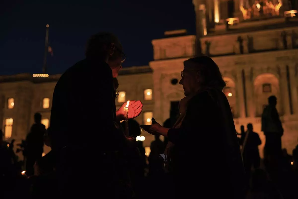 A candlelight vigil for former House Speaker Melissa Hortman and her husband Mark, who were fatally shot, at the state Capitol, Wednesday, June 18, 2025, in St. Paul, Minn. (AP Photo/Nikolas Liepins)