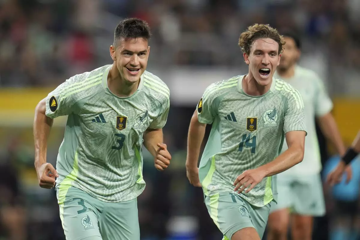Mexico defender César Montes (3) celebrates his goal with Marcel Ruiz during a CONCACAF Gold Cup soccer match against Suriname Wednesday, June 18, 2025, in Arlington, Texas. (AP Photo/Julio Cortez)