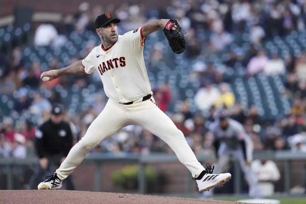 San Francisco Giants pitcher Justin Verlander throws to a Cleveland Guardians batter during the first inning of a baseball game Wednesday, June 18, 2025, in San Francisco. (AP Photo/Godofredo A. Vásquez)