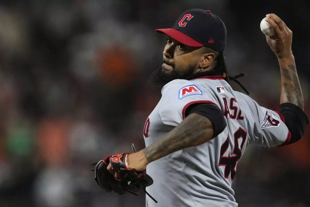 Cleveland Guardians pitcher Emmanuel Clase throws to a San Francisco Giants batter during the ninth inning of a baseball game Wednesday, June 18, 2025, in San Francisco. (AP Photo/Godofredo A. Vásquez)