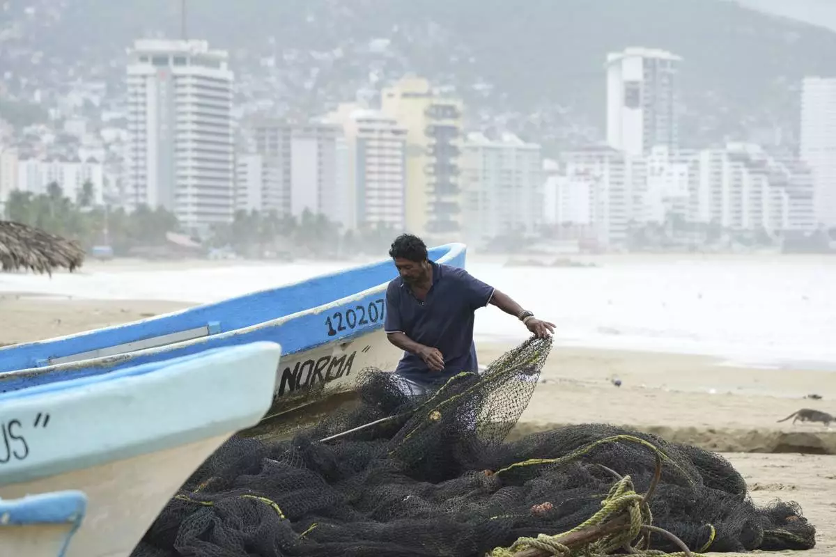 A fisherman maintains his net while his boat is off the water on Manzanillo beach as Hurricane Erick passes near Acapulco, Mexico, Thursday, June 19, 2025. (AP Photo/Fernando Llano)