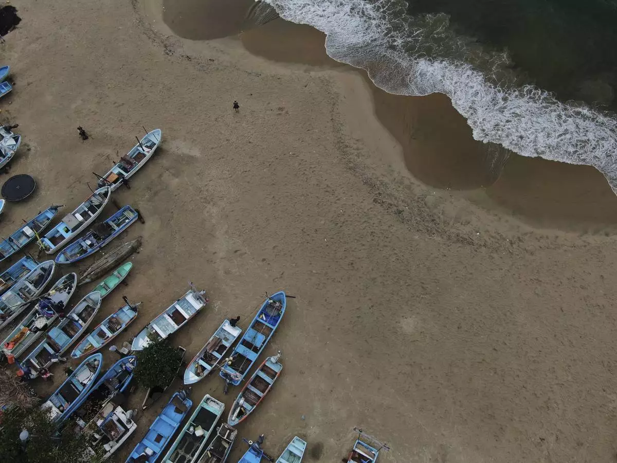 Fishing boats sit on Manzanillo beach for safe keeping after Hurricane Erick hit near Acapulco, Mexico, Thursday, June 19, 2025. (AP Photo/Fernando Llano)