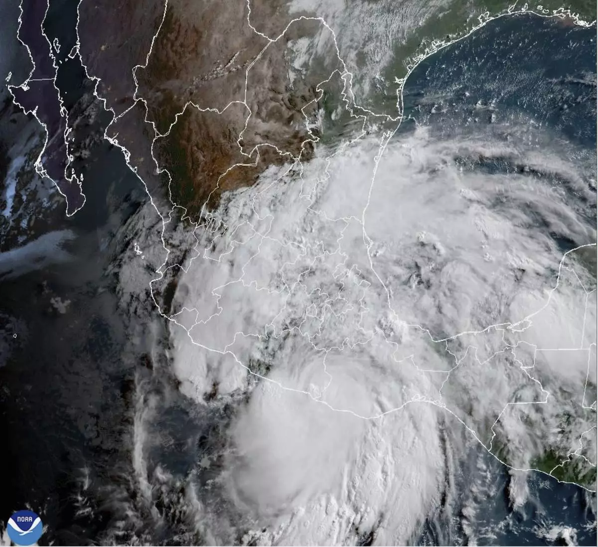 This satellite image provided by the National Oceanic and Atmospheric Administration (NOAA) shows Hurricane Erick making landfall in Mexico early Thursday, June 19, 2025. (NOAA via AP)