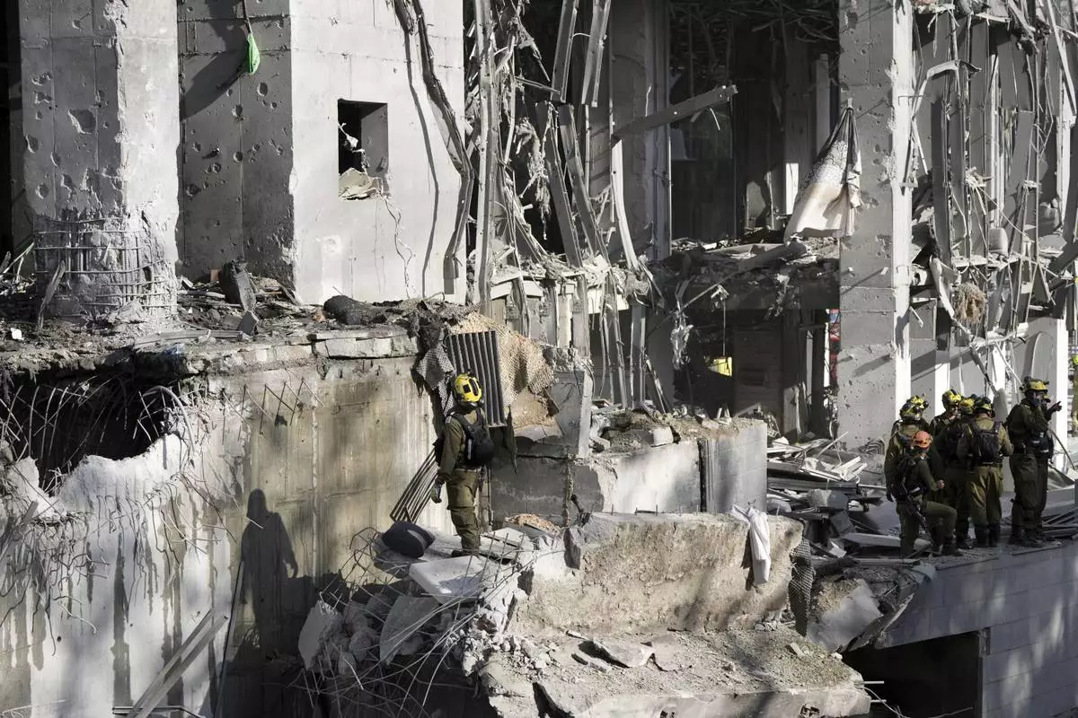 Rescue workers and military personnel inspect the site of a direct hit from an Iranian missile strike in Ramat Gan, Israel, Thursday, June 19, 2025. (AP Photo/Oded Balilty)