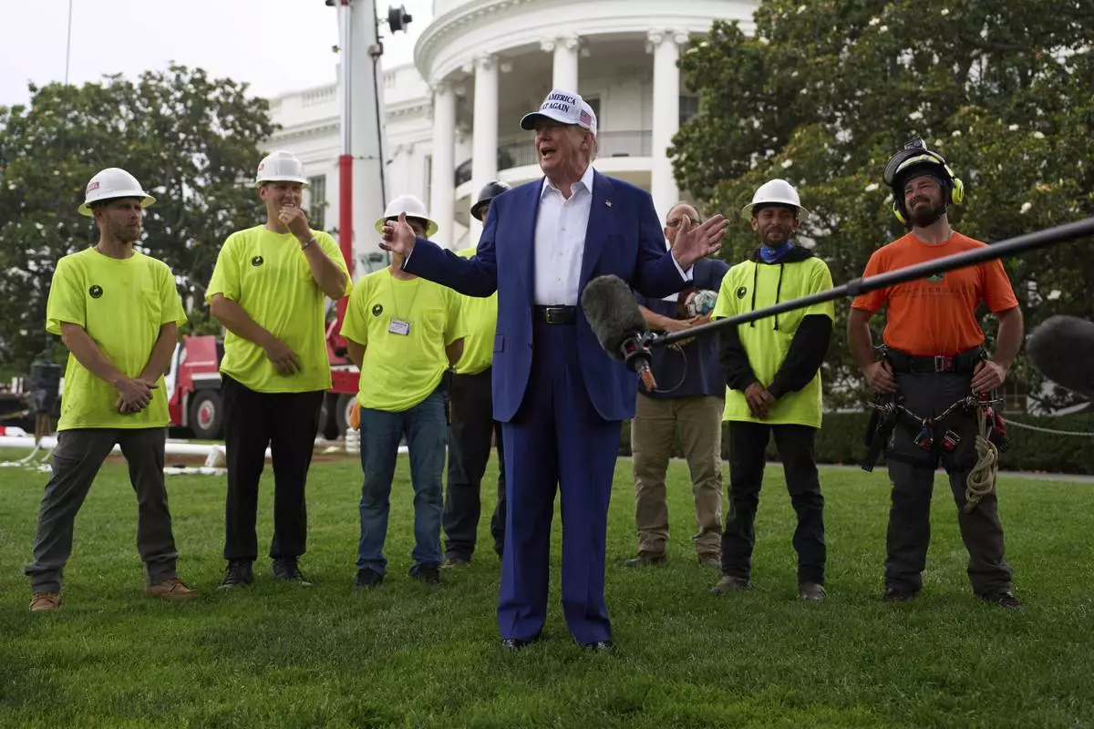 President Donald Trump speaks with reporters before a flag pole is installed on the South Lawn of the White House, Wednesday, June 18, 2025, in Washington. (AP Photo/Evan Vucci)