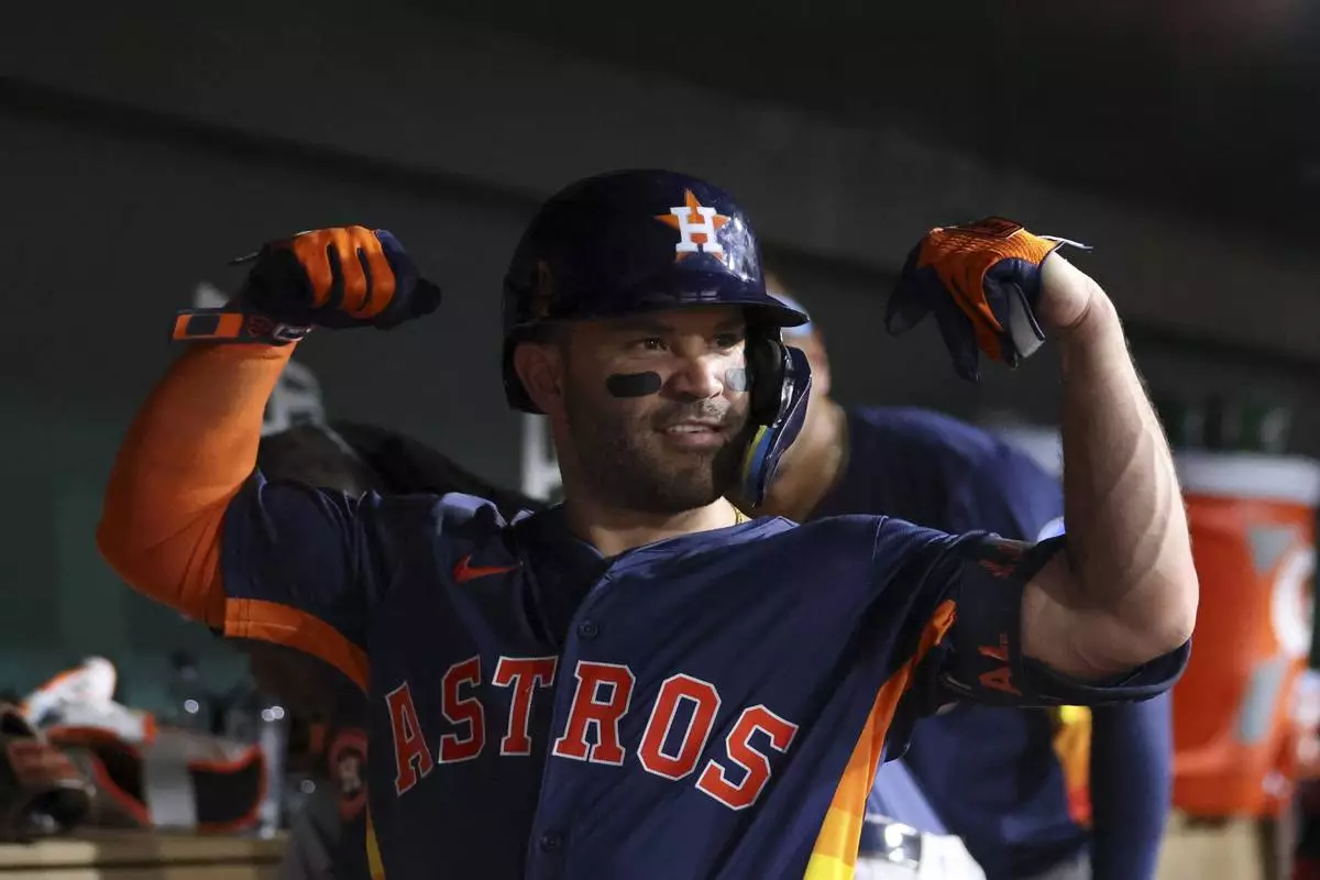 Houston Astros' Jose Altuve flexes in the dugout after hitting a three run home run against the Athletics during the sixth inning of a baseball game Wednesday, June 18, 2025, in West Sacramento, Calif. (AP Photo/Scott Marshall)