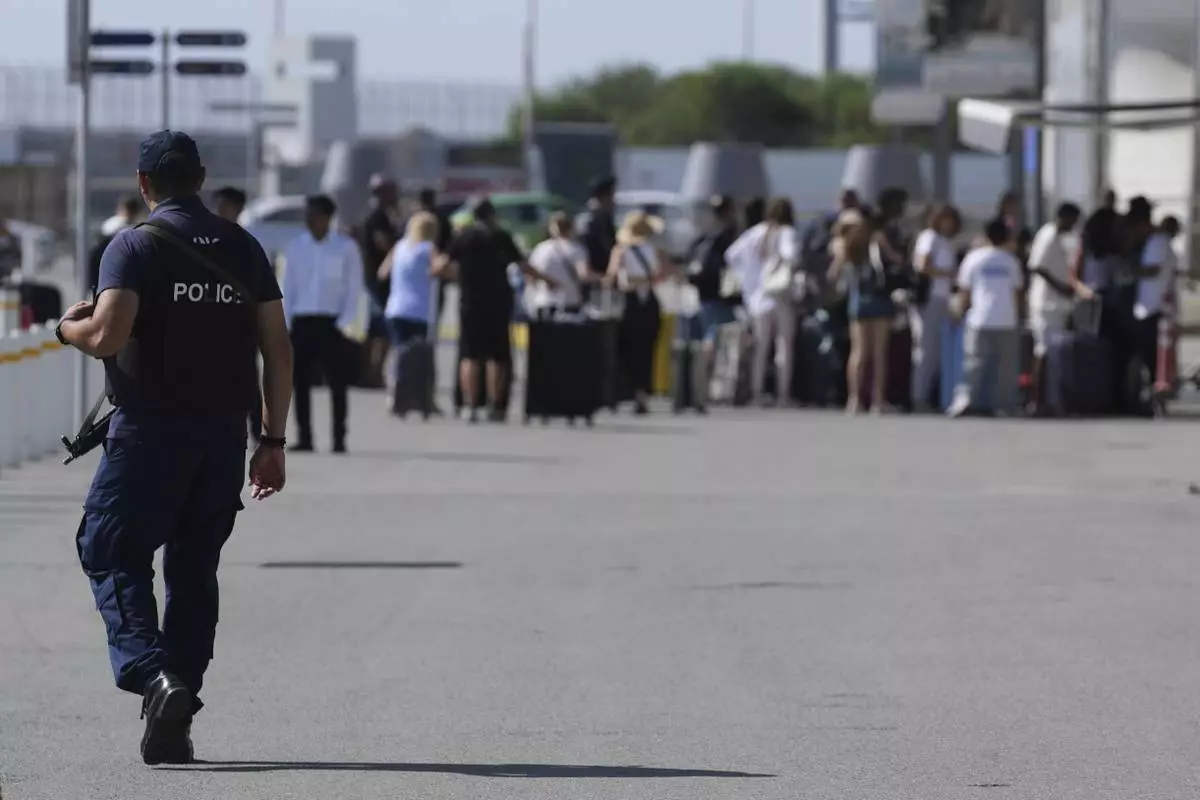 A Cypriot police officer patrols outside the departures terminal at Cyprus' main port in Limassol where they'll board the Israeli cruise ship Crown Iris to take them back to their homeland, on Thursday, June 19, 2025. (AP Photo/Petros Karadjias)