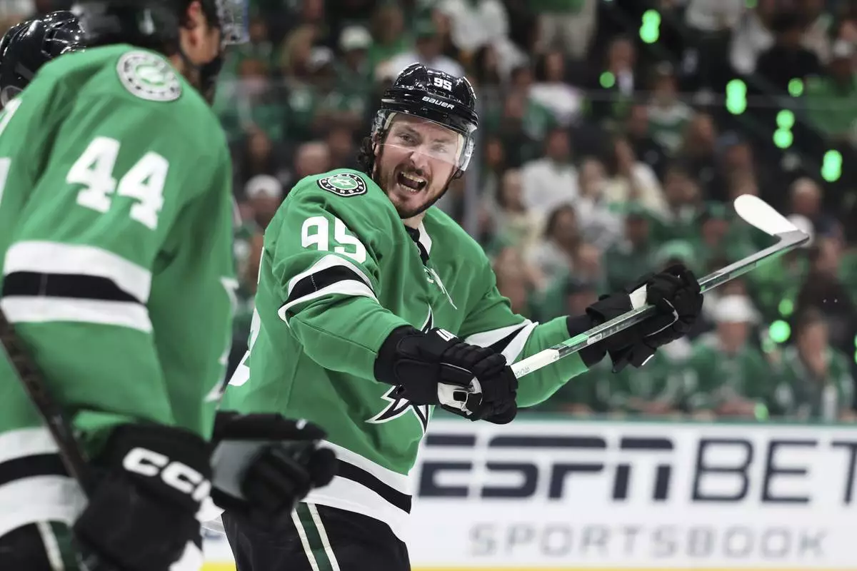 FILE - Dallas Stars' Matt Duchene (95) reacts to play against the Winnipeg Jets in the second period of Game 6 of a second-round NHL hockey playoff series in Dallas, Saturday, May 17, 2025. (AP Photo/Gareth Patterson, File)
