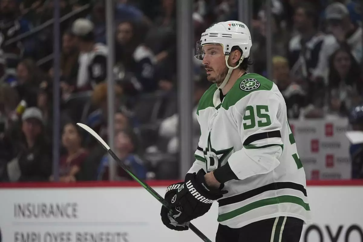 FILE - Dallas Stars center Matt Duchene (95) in the second period of Game 6 of an NHL first-round hockey playoff series Thursday, May 1, 2025, in Denver. (AP Photo/David Zalubowski, File)