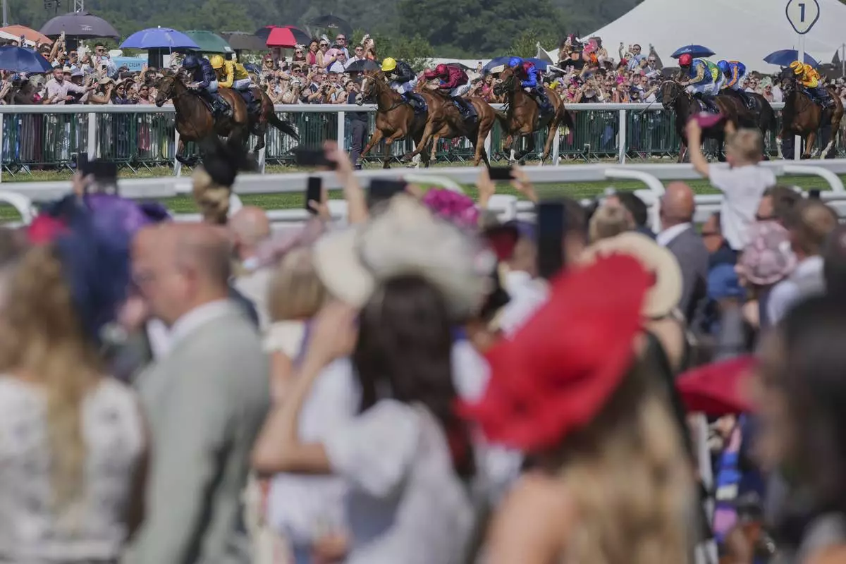 Crowds cheers on the horses running in the Ribblesdale Stakes on the third day of the Royal Ascot horse race meeting, traditionally called Ladies Day, at Ascot, England, Thursday, June 19, 2025. (AP Photo/Kin Cheung)