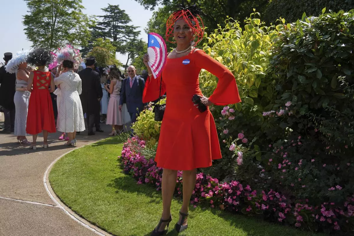 Wilnelia Merced poses for photographs holding fan with the flag of Puerto Rico on it, on the third day of the Royal Ascot horse race meeting, traditionally called Ladies Day, at Ascot, England, Thursday, June 19, 2025. (AP Photo/Kin Cheung)