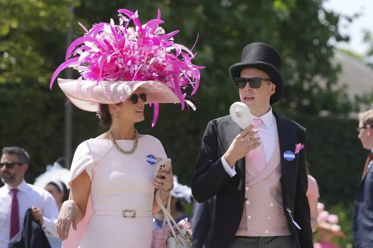 Racegoers arrive carrying a portable fan to keep cool as temperatures are set to rise to 30c (86f), on the third day of the Royal Ascot horse race meeting, traditionally called Ladies Day, at Ascot, England, Thursday, June 19, 2025. (AP Photo/Kin Cheung)