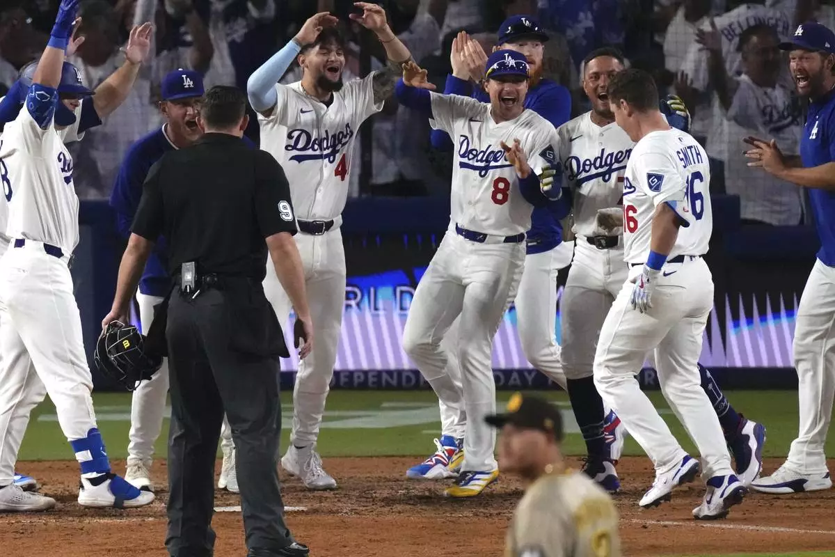 Los Angeles Dodgers' Will Smith, second from right, celebrates with teammates after hitting a walk-off home run as San Diego Padres third baseman Manny Machado walks off the field during the ninth inning of a baseball game, Wednesday, June 18, 2025, in Los Angeles. (AP Photo/Mark J. Terrill)