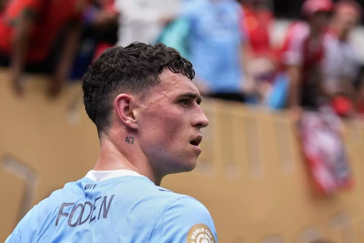 Manchester City's Phil Foden walks on the pitch during the Club World Cup group G soccer match between Manchester City and Wydad AC in Philadelphia, Wednesday, June 18, 2025. (AP Photo/Chris Szagola)